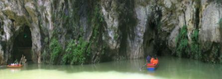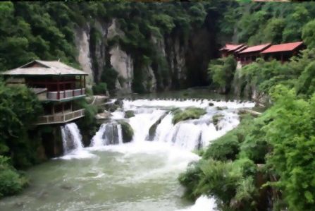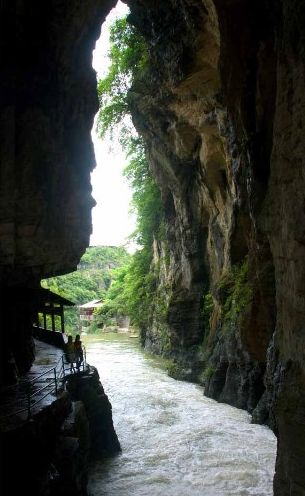 水洞长1000余米,半是人工半天然,登舟入洞,借助稀疏的灯光和导游的手电筒辨认着一处一处各各不同的景物,颇有一点神秘之感。洞尽船出,豁然开朗,但见茂竹修篁丛丛簇簇,一泓绿水微波不兴,野趣天成,静谧无声,此处名“竹林翠溪”,宛如一世外桃源。旱洞共三层,满布着形态各异的石钟乳、石笋、石柱、石幔,其第三层洞厅轩敞,一座天然石桥飞架两悬崖间,人称“奈何桥”,桥下即是深不可测的阴潭,景观之奇特,令人叫绝。旱洞出口处,有苗寨一座,是专为旅游者兴建的,游人尽可在此亲身体验一次苗家的婚俗。