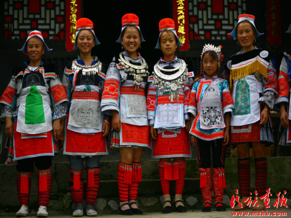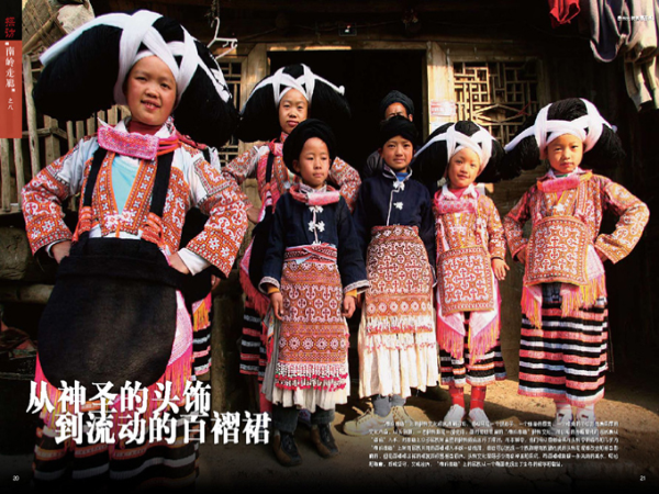 “南岭走廊”上的服饰文化极其绚丽多彩,哪怕只是一个银扣子、一个蜡染的图案、一个裙角的花边都有着深厚的文化内涵。从头到脚,一套服饰就是一部史诗。面对如此丰富的“南岭走廊”服饰文化,在以前的专题里我们尝试着从“蓝色”入手,对走廊上众多民族所喜爱的服饰颜色进行了探讨。在本期中,我们将从图腾崇拜在头饰中的遗存和几乎为“南岭走廊”上所有民族共有的百褶裙入手做一些梳理,由此可以发现一个族群带有族徽性质的头饰是很难改变和相互影响的,但是百褶裙这样的裙装却极易相互吸纳。头饰文化显得多少有些神圣和深沉,而百褶裙就像一条流淌的溪水,轻松和随意。既能坚守,又能接纳,“南岭走廊”上的民族从一个侧面表现出了生存的哲学和智慧。